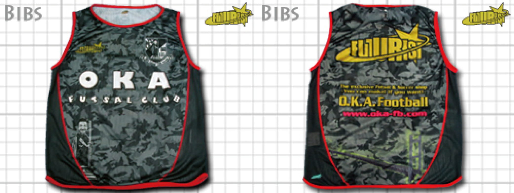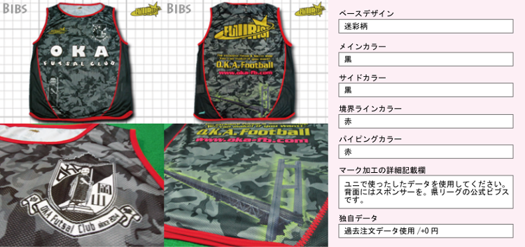 岡山県フットサルリーグに2014年から参戦している、O.K.A.フットサルクラブのベンチメンバーが着用しているビブス。