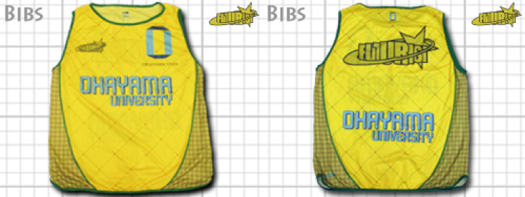 昇華ユニフォームのデザインをベースに、使っていない黄色を採用した、岡山大学フットサル部様の公式専用ビブス。