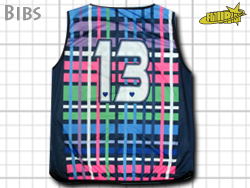 岡山県フットサルリーグ・1部の est様のビブス。ギンガムチェックのベースに、ワッペンのラインを胸に渡すデザインを採用。